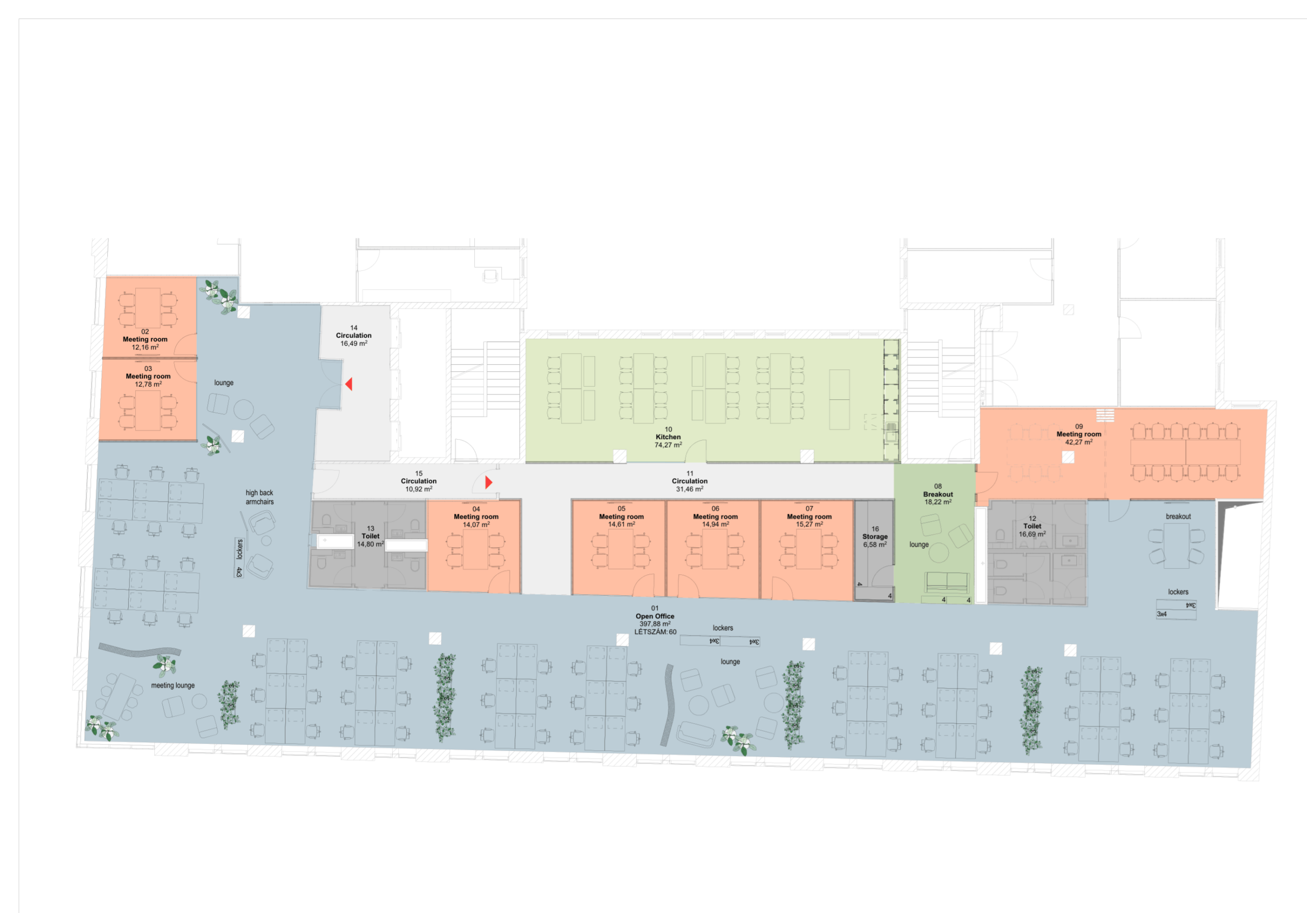 Bérlői igények szerint, minőségi anyaghasználattal akár 2 800 m² egybefüggő irodaterület is kialakítható.